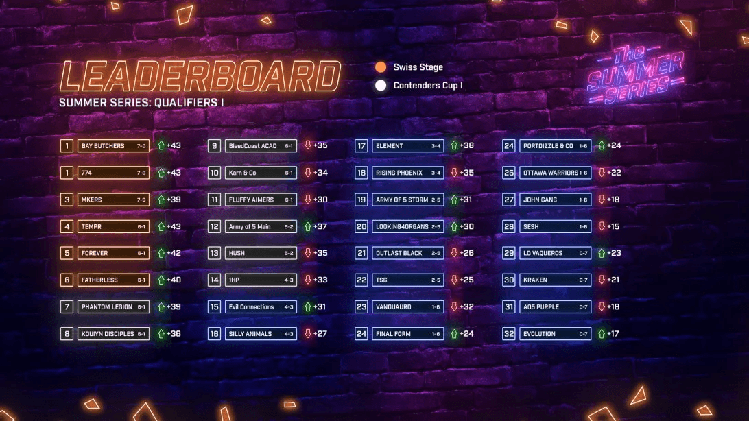 THERE WERE 7 QUALIFYING TEAM CHANGES BETWEEN SWISS STAGE AND CONTENDERS CUP I FROM DAY ONE TO DAY TWO OF QUALIFIERS I.